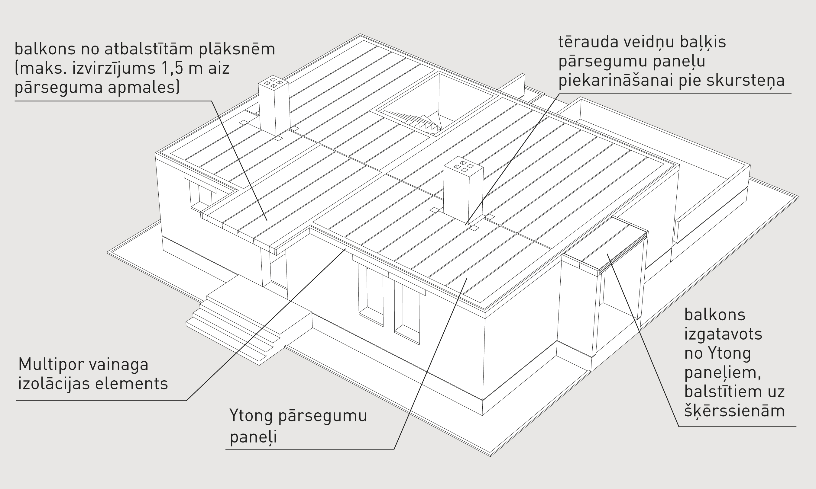 Pateicoties Ytong pārseguma plātņu īpašajām īpašībām, no tām var izveidot balkona plātnes ar projekciju līdz 150 cm, kas samazina vienu no jutīgākajām siltuma tiltu rašanos.